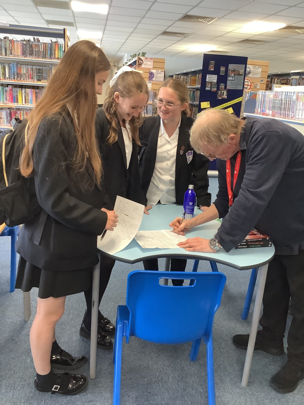 School visit: The picture shows me meeting pupils during my visit in 2024 to Jack Hunt School, in Peterborough, whose library is run by Laura. I ran several writing workshops during the day for pupils at the secondary school/sixth form. Although I charge for workshops, I do not do so when they involve libraries, as was the case here. I never charge libraries, in line with my role as one of three national Crime Writers’ (CWA) Association Library Champions. The event took place during National Crime Reading Month., which is run by the CWA and national charity The Reading Agency.